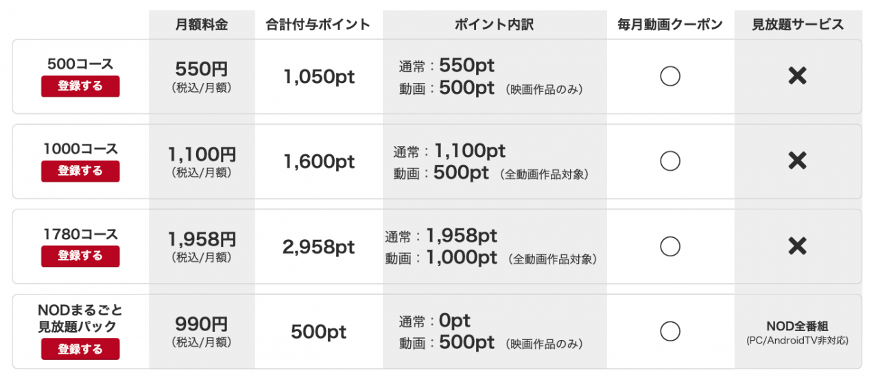 • 500コース 550円(税込)/550ポイント+毎月500円分の動画ポイント